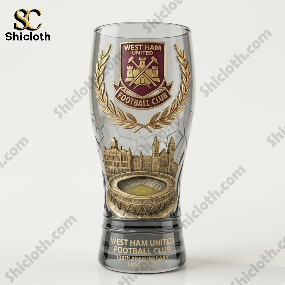 To celebrate 130 years of history, the West Ham United 130th Anniversary Commemorative Pilsner Beer Glass is the ultimate tribute for any Hammers fan. This 15oz glass is more than just drinkware; it is a collectible piece of art featuring a high-quality dye-sublimation print that brings the club’s legacy to life. The design is centered around the iconic West Ham crest, flanked by a golden laurel wreath and the years 1895–2025. Beneath the crest, you will find a highly detailed, embossed-style 3D rendering of the London Stadium and historic architectural motifs, all set against a subtle hexagonal football net pattern. The base is elegantly finished with a dark gradient and bold gold lettering, marking the 130th Anniversary milestone.