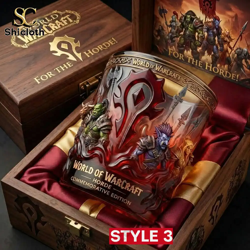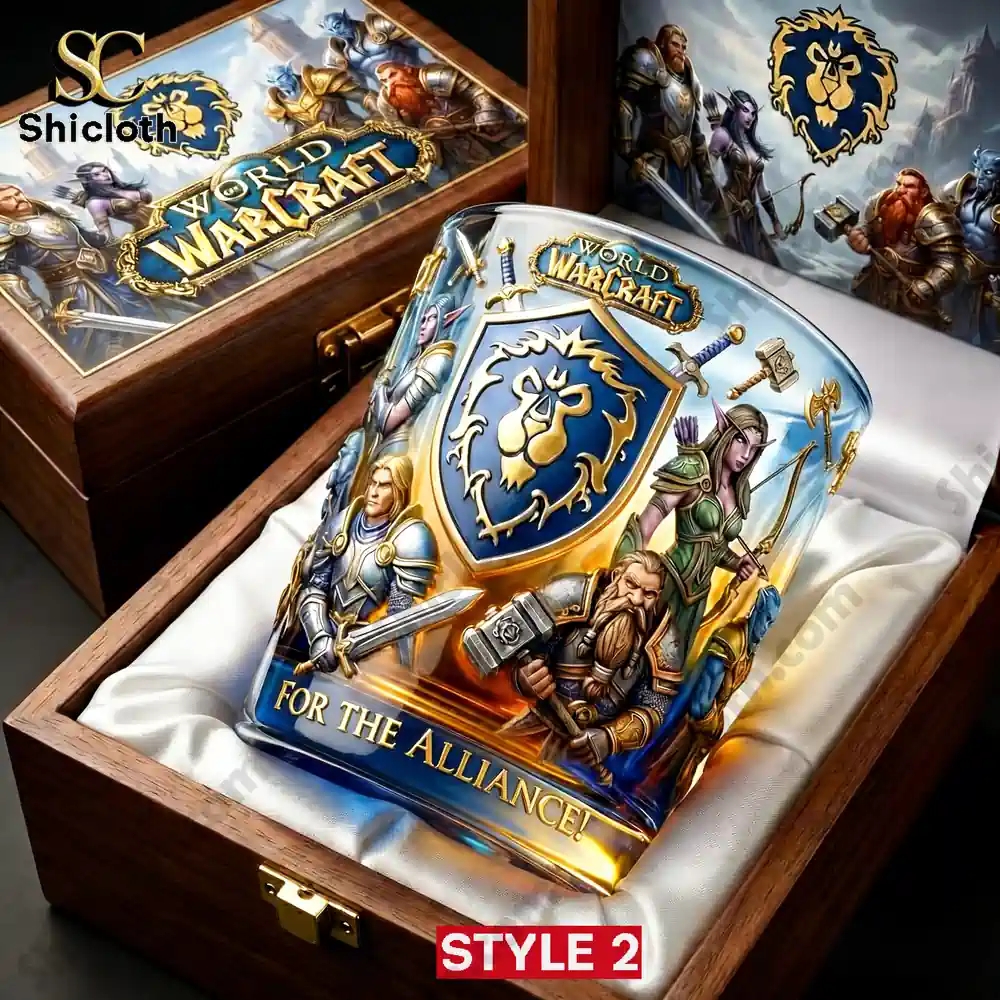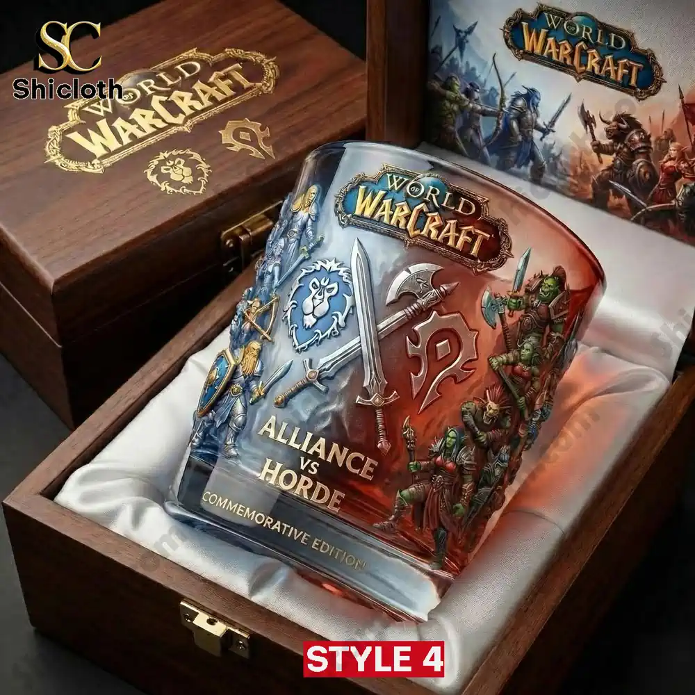 You can choose from four distinct designs to match your faction pride. Style 1 offers a balanced tribute with both faction logos and legendary weapons, while Style 2 is dedicated “For the Alliance,” featuring Varian Wrynn and night elf imagery. Style 3 focuses on the Horde with “For the Horde!” text and rugged orcish motifs, and Style 4 depicts the epic “Alliance vs Horde” struggle. Each glass comes in a luxurious wooden display box with silk lining, making it a perfect housewarming or birthday gift. Because the glass is finished with delicate textures, it is best to hand wash only and dry with a microfiber cloth to maintain its brilliant shine and prevent scratches.