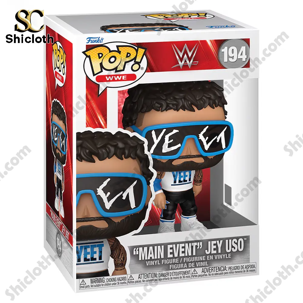 Bring the energy of the ring right into your home with this striking WWE Main Event Jey Uso Pop Figure. This collectible perfectly captures the “Yeet” era of Jey Uso, featuring his iconic blue-rimmed sunglasses with the word “YEET” printed boldly across the lenses in white. The figure is dressed in his signature white tank top, which also displays the “YEET” logo, paired with black wrestling pants and crisp white sneakers. Every detail is meticulously crafted, from his sculpted curly dark hair and groomed beard to the intricate tribal tattoo patterns visible on his left arm. Whether you are a long-time member of the Bloodline or a new fan of his solo run, this figure is a must-have tribute to one of wrestling’s most charismatic superstars.