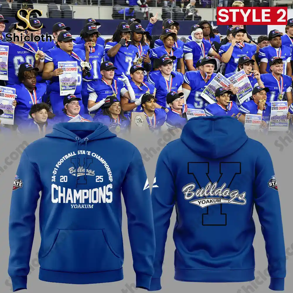 The Yoakum Bulldogs 2025 State Championship Hoodie is the ultimate way for fans to celebrate a historic victory. Available in three distinct stylesβclassic white, bold royal blue, and sleek blackβthis collection captures the pride of the 3A-D1 title with high-quality 3D digital printing. Each hoodie features a prominent “CHAMPIONS” graphic across the chest, flanked by the year 2025 and the official team branding. The back showcases a large, stylized “Y” with “Bulldogs” and “Yoakum” layered over it, ensuring your team spirit is visible from every angle. Small details like the Texas State Championship patch on the sleeve add an authentic touch to this commemorative gear.
